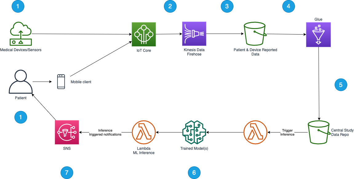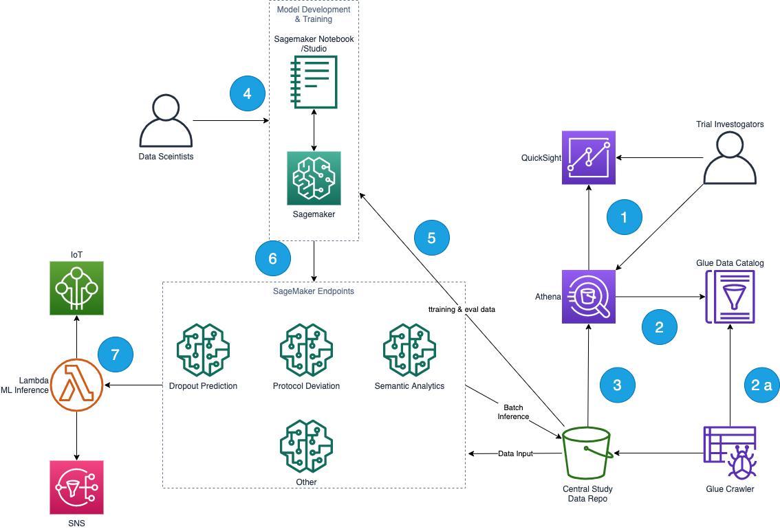 - SageMaker endpoints are used by Lambda functions and other APIs to trigger notifications to patients, research team and other stakeholders via Amazon SNS and AWS IoT