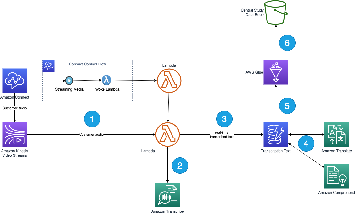 - When a patient calls into the Amazon Connect call center, their call progresses through a contact flow and customer audio is streamed in real time through Amazon Kinesis Video Streams.
