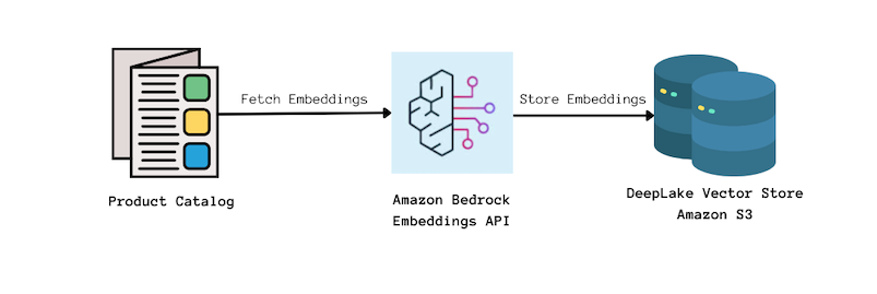 [Fig 2] Continuous retrieval of product embeddings through the Amazon Bedrock embedding API and storing in a Deeplake vector store