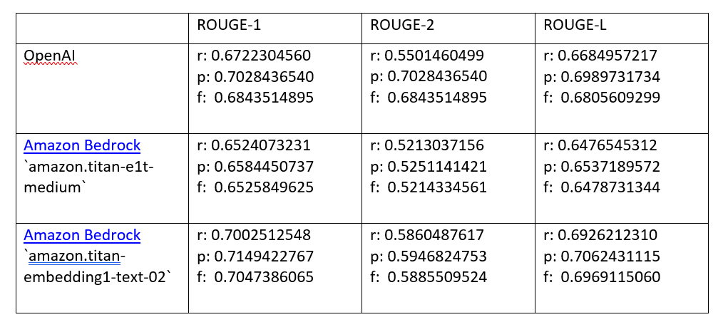 Here are some metrics from our internal quality testing. These metrics were computed on an open-sourced product catalog of about 10,000 books. Embeddings for these books were fetched from Amazon Bedrock and OpenAI. Using these embeddings, the top five semantic nearest neighbors were computed for each book. Average ROUGE (Recall-oriented understudy for gisting evaluation-is a set of metrics and a software package used for evaluating automatic summarization and machine translation software in natural language processing) values were computed for the top 5 nearest neighbors for all the products.