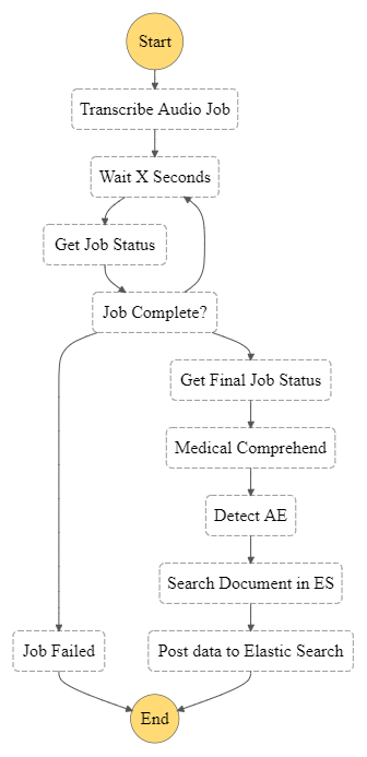The step function states above is kicked off when a call recording is uploaded to the s3 bucket. The call recording is sent to transcribe job which is polled until finished. The output of transcribe is sent to Comprehend Medical which is then sent to a function that detects and maps adverse events in Neptune. Finally, the output of Neptune is sent to a function that populates data in an Elastic search Database.