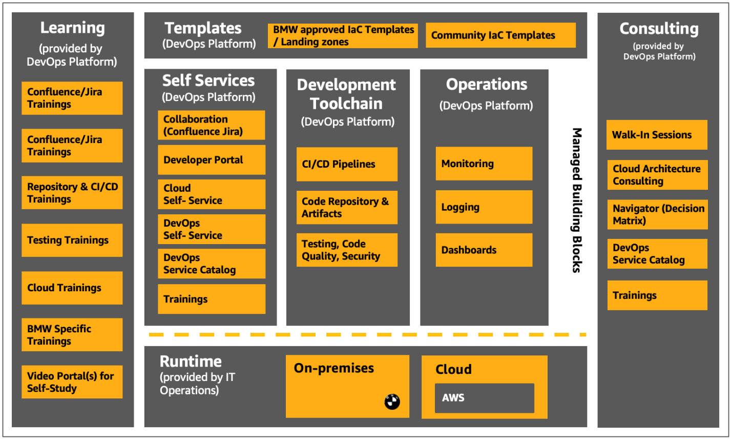 The AWS-BMW strategic collaboration aimed at accelerating BMW’s pace of innovation across all company processes. One of the results of this collaboration was the cloud-driven transformation of business applications. With pre-approved building blocks, BMW business owners can now make more informed decisions as needed instead of requiring multiple iterations over several weeks. DevOps teams at the BMW Group can rely on architectural baselines and reusable artifacts to deploy their microservices with minimal friction.