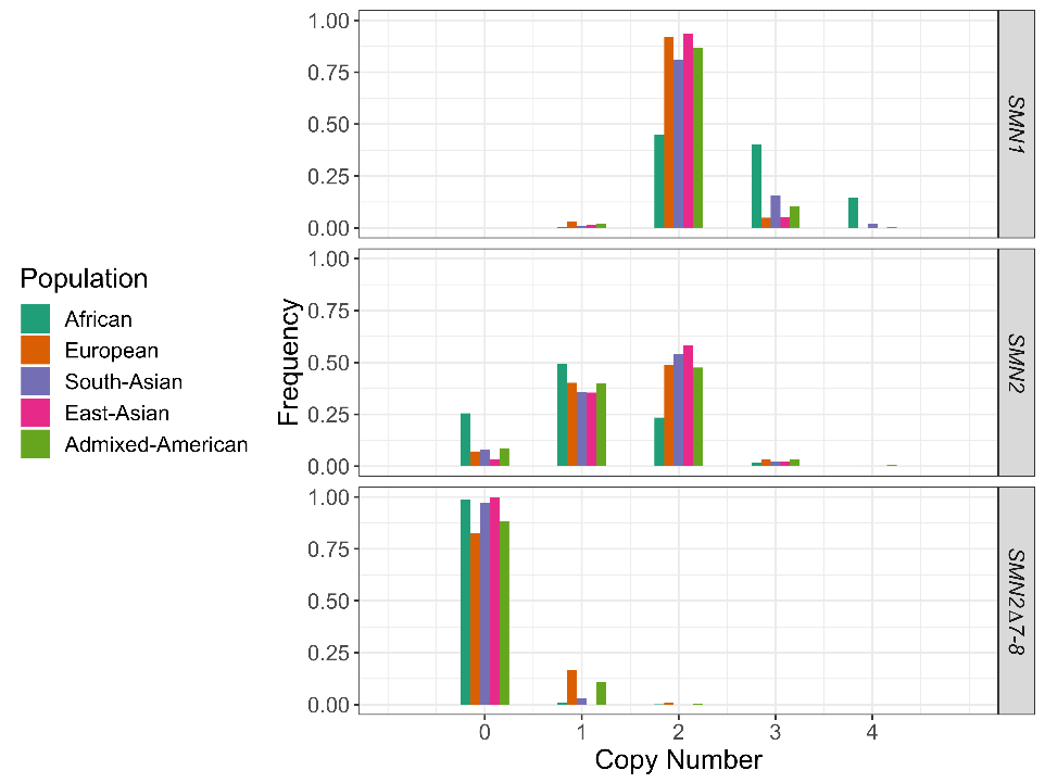 Figure 1: Distribution of SMN1, SMN2 and SMN2∆7-8 (a truncated form of SMN2) copy numbers across five populations in 1kGP. Having zero copies of SMN1 indicates a high risk for SMA. One of SMN1 indicates an SMA carrier. The copy number of SMN2 is important for clinical classification and prognosis for SMA patients.