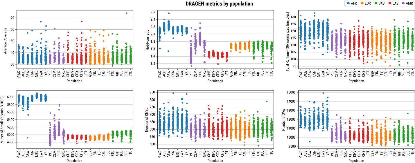 Figure 4:  A subset of DRAGEN metrics plotted against 1KG populations. The 1KG samples are colored by the 5 major super-populations (AFR, EUR, SAS, EAS, AMR).  The x-axis is ordered by the super-population and stratified by the population. Top row, from left to right:  Average Coverage (35.6x +/- 3.86x). Het/Hom captures notable ancestry dependent features and is used as a QC check.  Total Runtime (normalized to 30x depth) demonstrates the speed at which DRAGEN can map-align, and variant call across ALL variant classes (all populations, 114.98m +/- 5.05m). AFR samples in blue demonstrate a slightly higher runtime, due to the hg38 reference bias (120.07m +/- 3.96).  Bottom Row, from left to right: Number of Small Variants (single nucleotide variant (SNV) and INDEL).  Number of Copy Number Variants (CNV, amplifications & deletion).  Number of Structural Variants (SV, deletions, insertions and duplications).