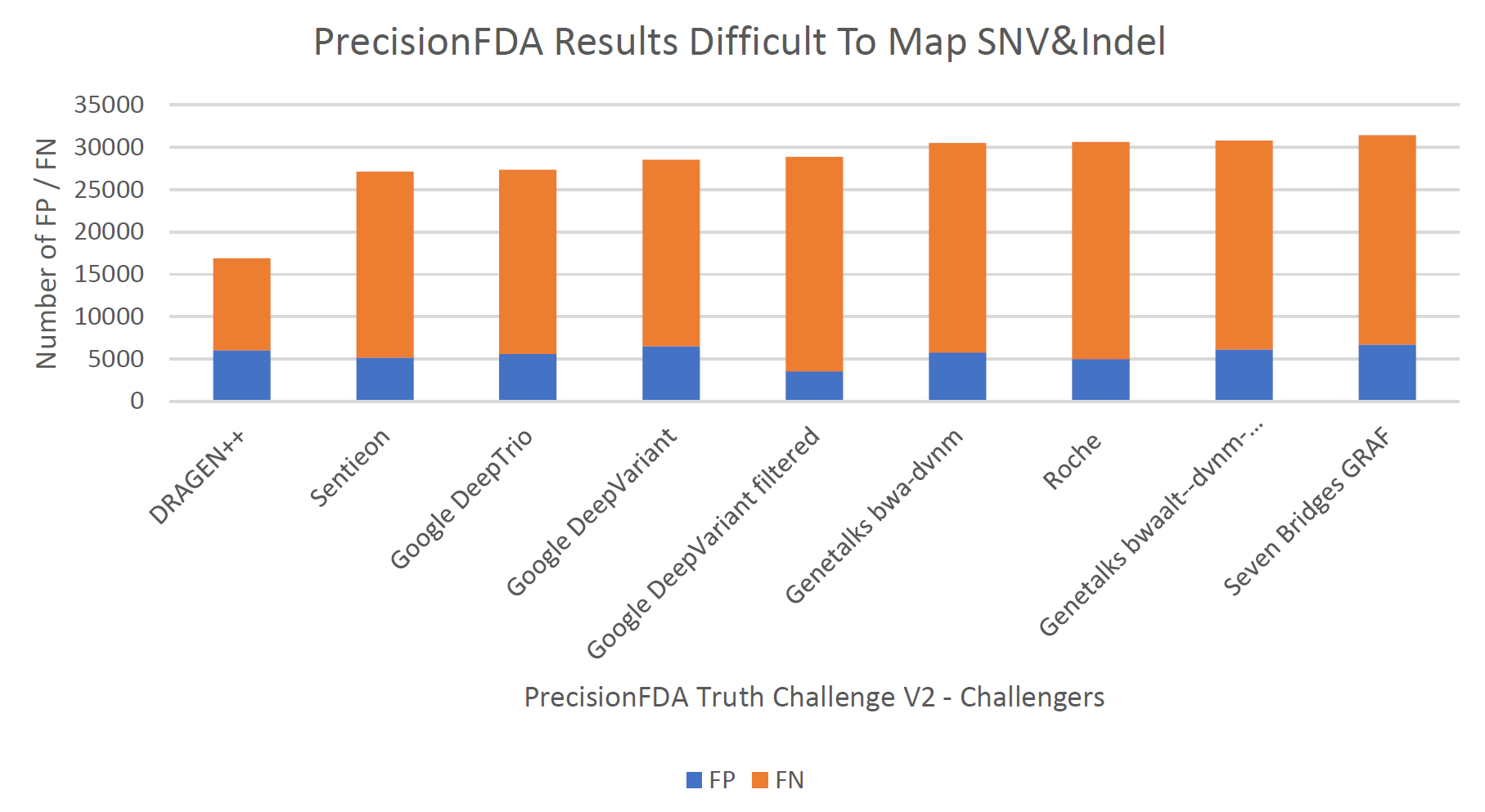 Figure 2:  Bar plot demonstrating DRAGEN accuracy (depicted by the number of false-negative (FN) and false-positive (FP), less is better) as compared to the other leading entries in the PrecisionFDA Truth Challenge V2.  The DRAGEN team took 1st place in the challenge in two categories: calling variants on Illumina sequencing data in Difficult-to-Map Regions (shown here) and All Benchmark Regions (data not shown).  DRAGEN++ (left most bar plot) performed best by a comfortable margin, with 28% fewer missed calls in all benchmark regions and 38% fewer in difficult-to-map areas. Plot from https://precision.fda.gov/challenges/10/view/results.