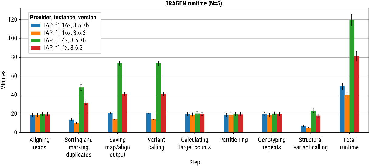 Figure 3:  Bar plot demonstrating DRAGEN run-time from a representative set of ~30X 1000genomes 2,504 high-depth samples. The y-axis shows the time, and the x-axis stratifies by the ‘step’ within the DRAGEN germline pipeline.  Each color bar represents a different combination of the provider (cloud platform), size (resource-type), and version (DRAGEN software).  Here, “IAP” represents the Illumina Analytics Platform running on AWS.  (Note, step timings are not additive as many steps run in parallel on the f1.4x node).  The final ‘step’ on the far-right (total runtime) captures the all-in-one E2E performance of DRAGEN to map-align and variant-call on a set of WGS samples.  Variant-calling include all major types (SNV, INDEL, CNV, SV, STR, and ROH).
