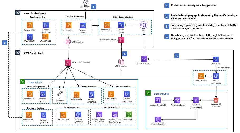 Now let’s look at how AWS can provide a jump start for banks with their ecosystem journey. Harnessing experience from banks, following is a reference architecture for banks to build their marketplace. This offers features and functionalities to integrate with FinTech organizations and partners through an open API platform. This architecture is built with a security first mindset, offering authentication through an identity provider and managing consent through a consent management system. The architecture also enables backend integration between the FinTech and the bank where they can share data to offer a more personalized customer experience.