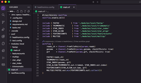 The AWS HealthOmics extension brings bioinformatics workflow development directly into the Kiro IDE. It provides full language support for WDL and Nextflow, — the two most widely used workflow languages in genomics — with syntax highlighting, IntelliSense, go-to-definition, find references, and real-time diagnostics. Whether you’re writing a new variant-calling pipeline or maintaining an existing RNA-seq workflow, the extension gives you the same rich editing experience you’d expect for any first-class programming language (Figure 1).