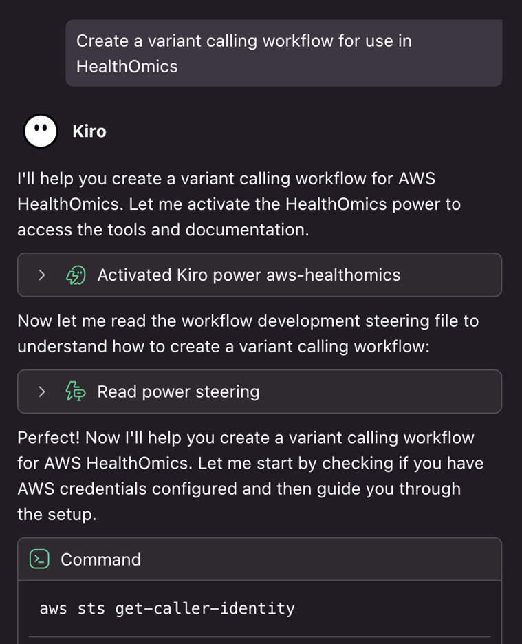 Figure 5: Initiation of a workflow creation process from a natural language prompt. Kiro recognizes that it can gain additional context on the required steps from the HealthOmics Kiro Power