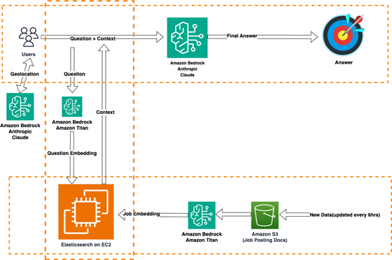 4. Knowledge Base: The Job posting data is first stored in Amazon Simple Storage Service (Amazon S3) and then vectorized using Amazon Titan embedding before being stored as a vector in Elasticsearch.