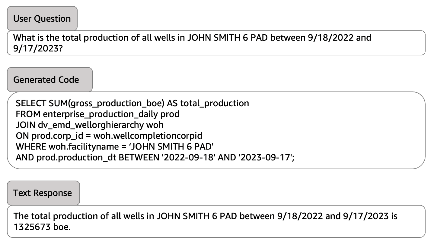 Xpert can generate visualizations based on user questions through text-to-Python generation—transforming a natural language prompt into executable Python code. This feature is valuable to bpx employees who regularly face the challenge of analyzing complex well production data to drive informed decision-making.