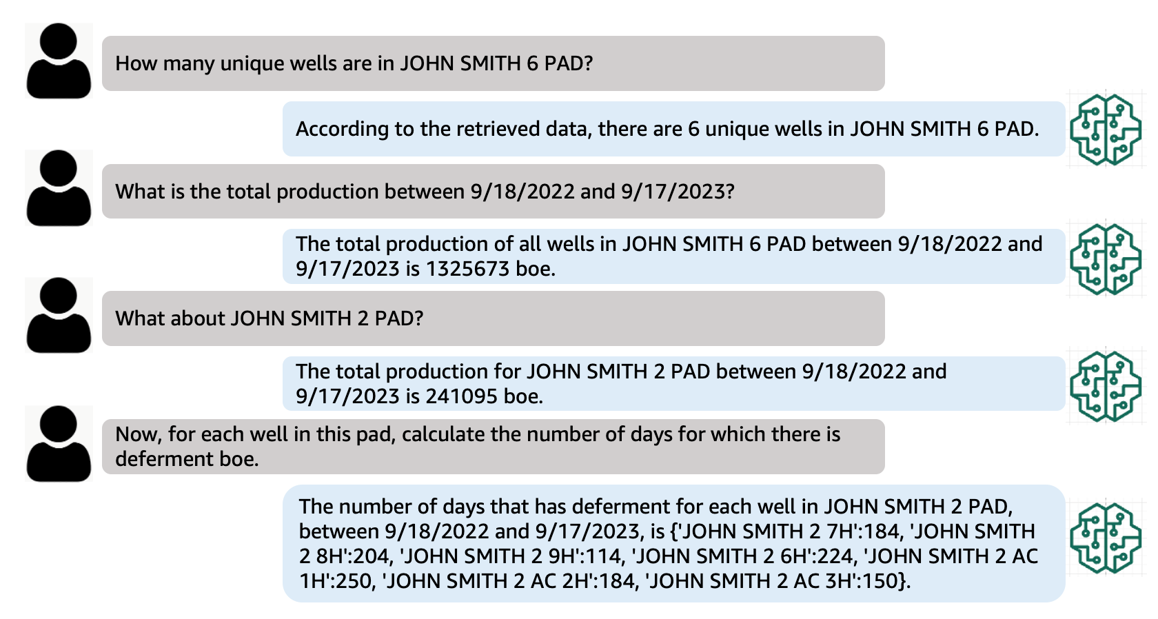 Multi-turn conversation lets users engage in natural back-and-forth exchanges, providing a seamless and intuitive user experience. While analyzing production data from wells, instead of restating the entire context with each new question, users can simply ask follow-up questions.