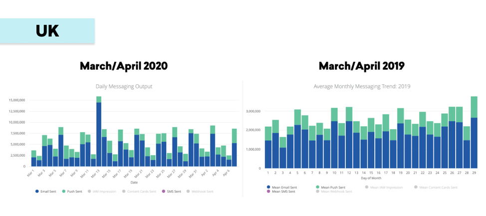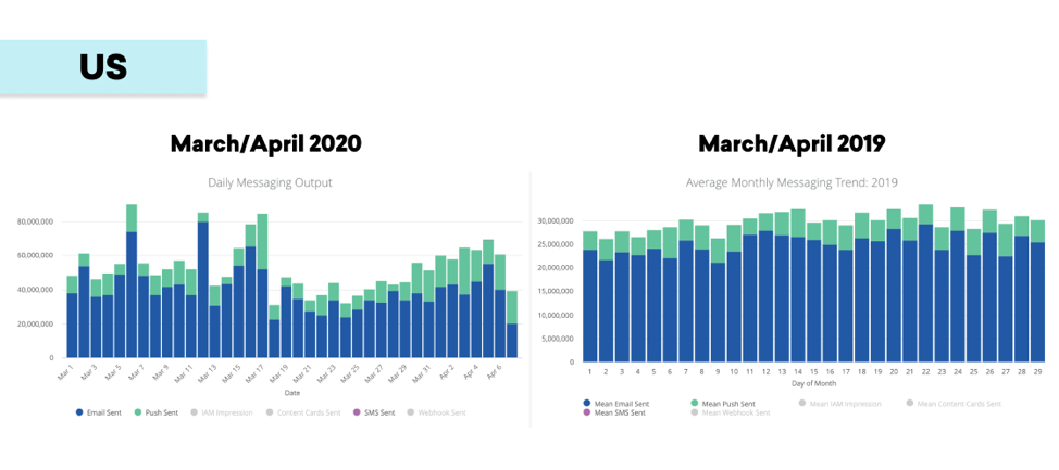 A similar dynamic played out in the US, characterized by both volatility in messaging outputs during March and early April and by the increased use of email as a channel by brands, in comparison to more stable messaging trends in March 2019.