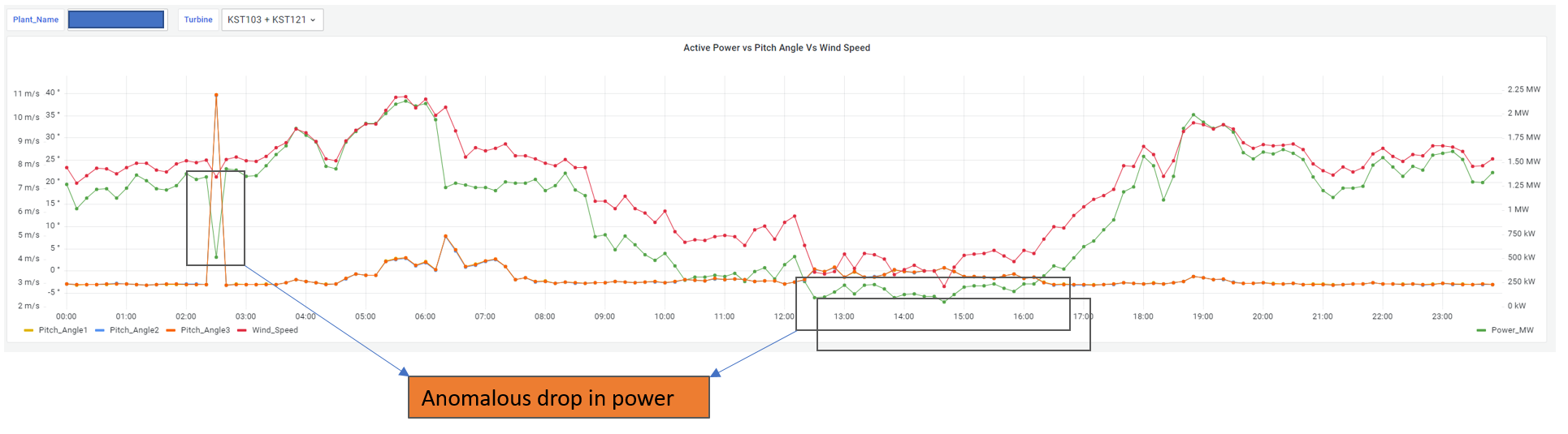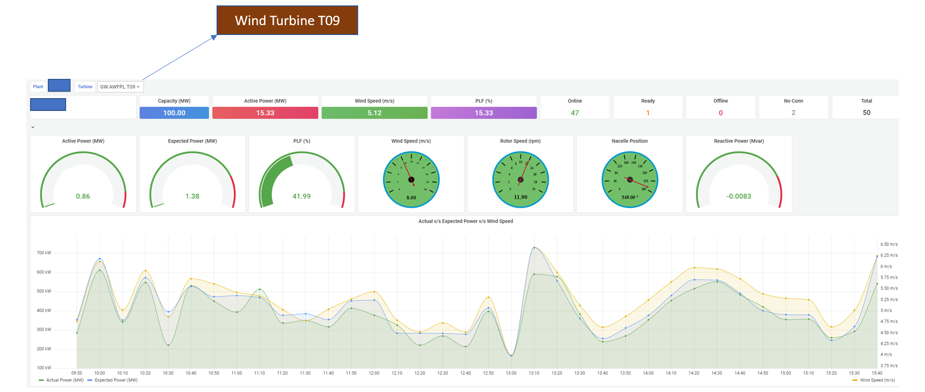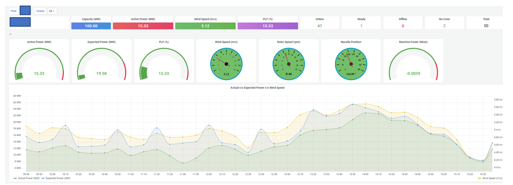 - consolidated operational monitoring – The Greenko engineering team now has a single consolidated view of its entire fleet of 2,200 wind turbines. This is further enriched and customized for the user based on the asset hierarchy maintained in InfluxDB. All this information is now available at the Greenko control room. At a click of a button, the engineers can drill down from fleet level to an individual asset, irrespective of its geographical location in India.