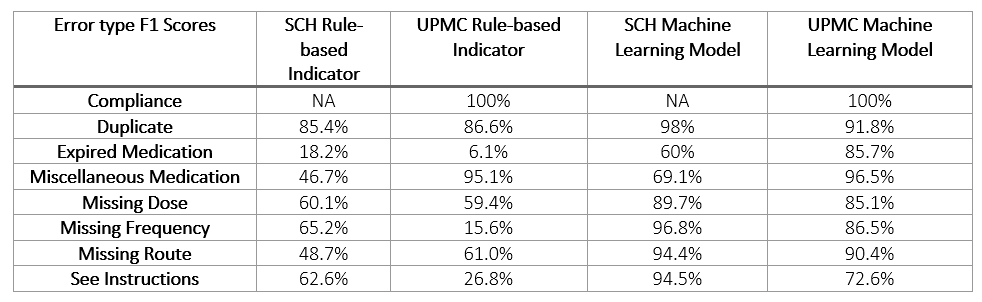 Using a de-identified data set of 30,000 individual medications across over 2000 patient discharges at each institution, we created ML models to identify eight error types from the complete medication instruction content. Curation of the 30,000 medications in each training data set took nearly 70 hours of clinician time. The ML models performed better than the standard rule-based indicators for nearly all error types. Furthermore, the AutoML functionality struggled to pull relevant information out of the clinical display line and free text fields, especially for complicated prescriptions.