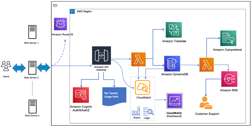 The following architecture diagram displays the API-based serverless solution for the localization of dynamic web content and the automatic detection of customer sentiment.