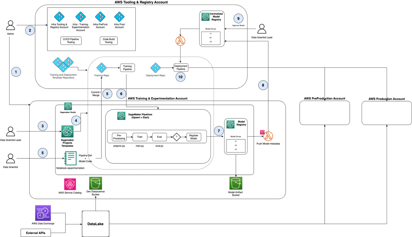 First, an administrator, persona ‘admin’ in Figure 1, creates the base infrastructure needed for the data science team to submit their models to the MLOps workflow (Step 1 in Figure 1). Initially, ‘admin’ creates three AWS accounts (Training and Experimentation, PreProduction, and Production) for the data science team and then executes Terraform scripts to create the base AWS cloud infrastructure in these accounts.