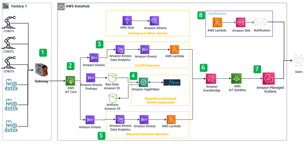 To analyze the Cobot’s “ON” and “OFF” status, real-time streaming data was aggregated over a given interval and sent to Kinesis Data Stream, which triggered an AWS Lambda function. This function uses a model stored in Amazon S3 to infer and send results to Amazon EventBridge.