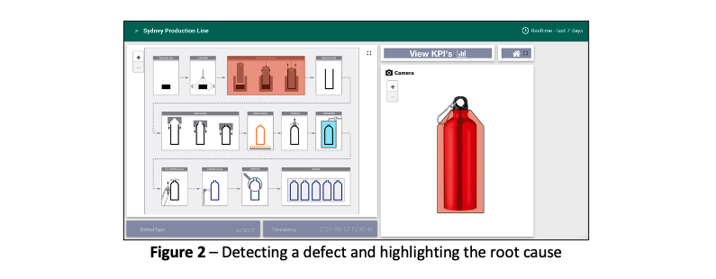 This view is integrated into our monitoring dashboard to augment human inspection, by making it more visual (in contrast of having only plain data/logs). With that, we can quickly highlight the manufacturing step that failed at a point in time, as we correlate the defect detection event with telemetric data from the machines.