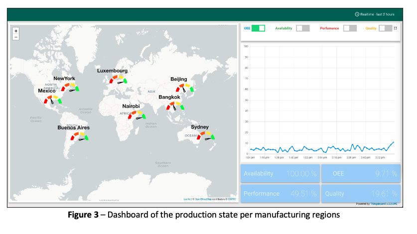 As described in the introduction, on top of having the low-level view of the production in one factory, we also want to have a high-level view of the production state at the enterprise level. To do so, we used a metric called OEE, which is calculated based on availability and performance of the machines, as well as the quality of the products. The objective is to aggregate those metrics at different levels to provide a view per region, per countries, per factories (see Figure 3 below, there are 8 regions covered here – Beijing, Bangkok, Sydney, Nairobi, Luxembourg, Buenos Aires, New York and Mexico).