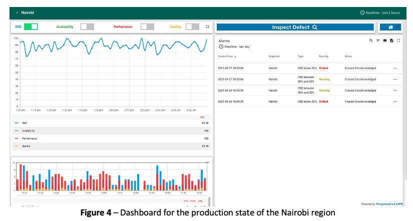 Using this dashboard, we are able to quickly identify if there is a problem in any of those regions, and have a high-level view of the problem. In our prototype, we have used metrics such as conveyor belt real-time speed, designed max speed, motor status (on/off) to calculate the availability and performance. For a production line in real world, you will add more metrics in the equation. Looking at the color gauges, you can compare the performance of different regions.