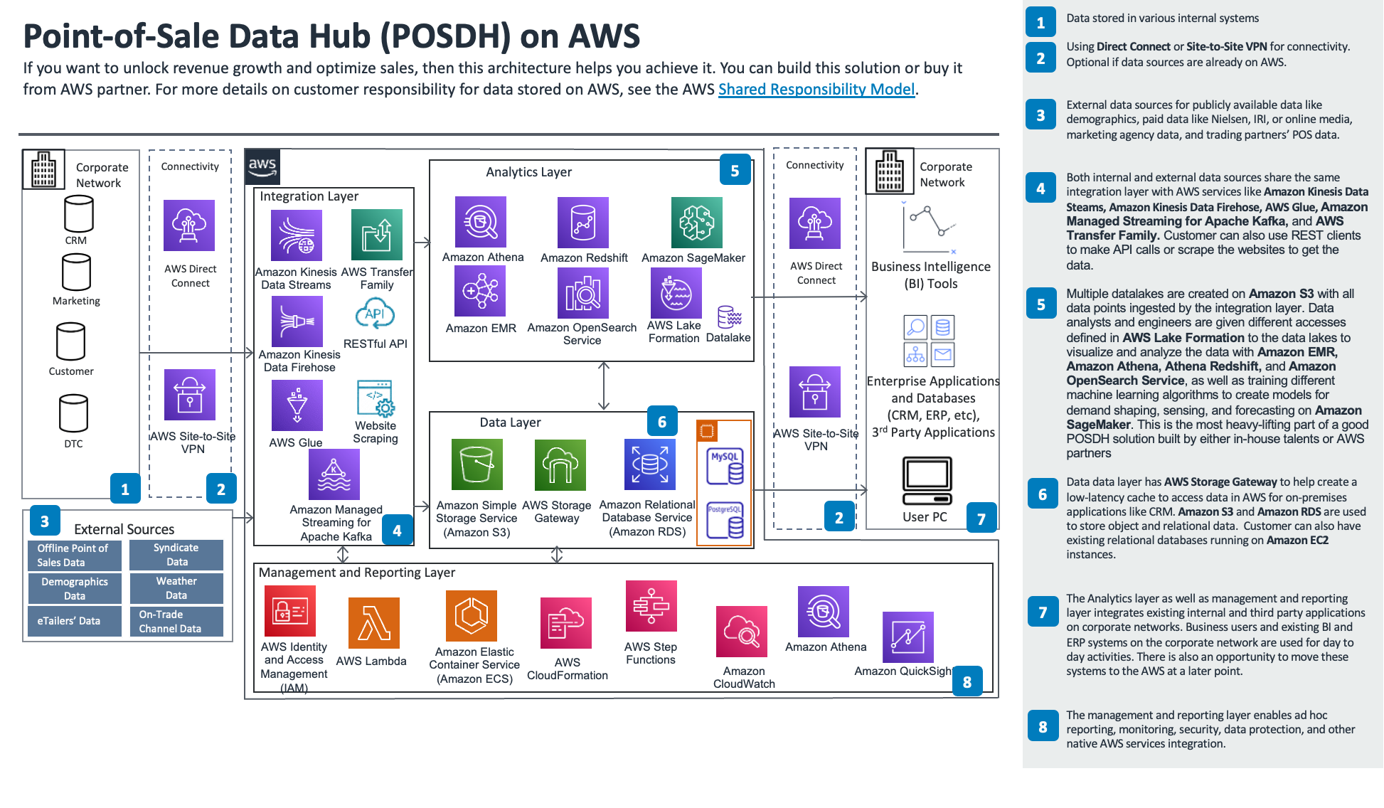 Sigmoid worked with the AWS team to create a reference POSDH architecture that broadly comprises ingestion, storage, analytics, dashboarding, reporting, and management layers. Figure 1 shows the typical reference architecture for POSDH.