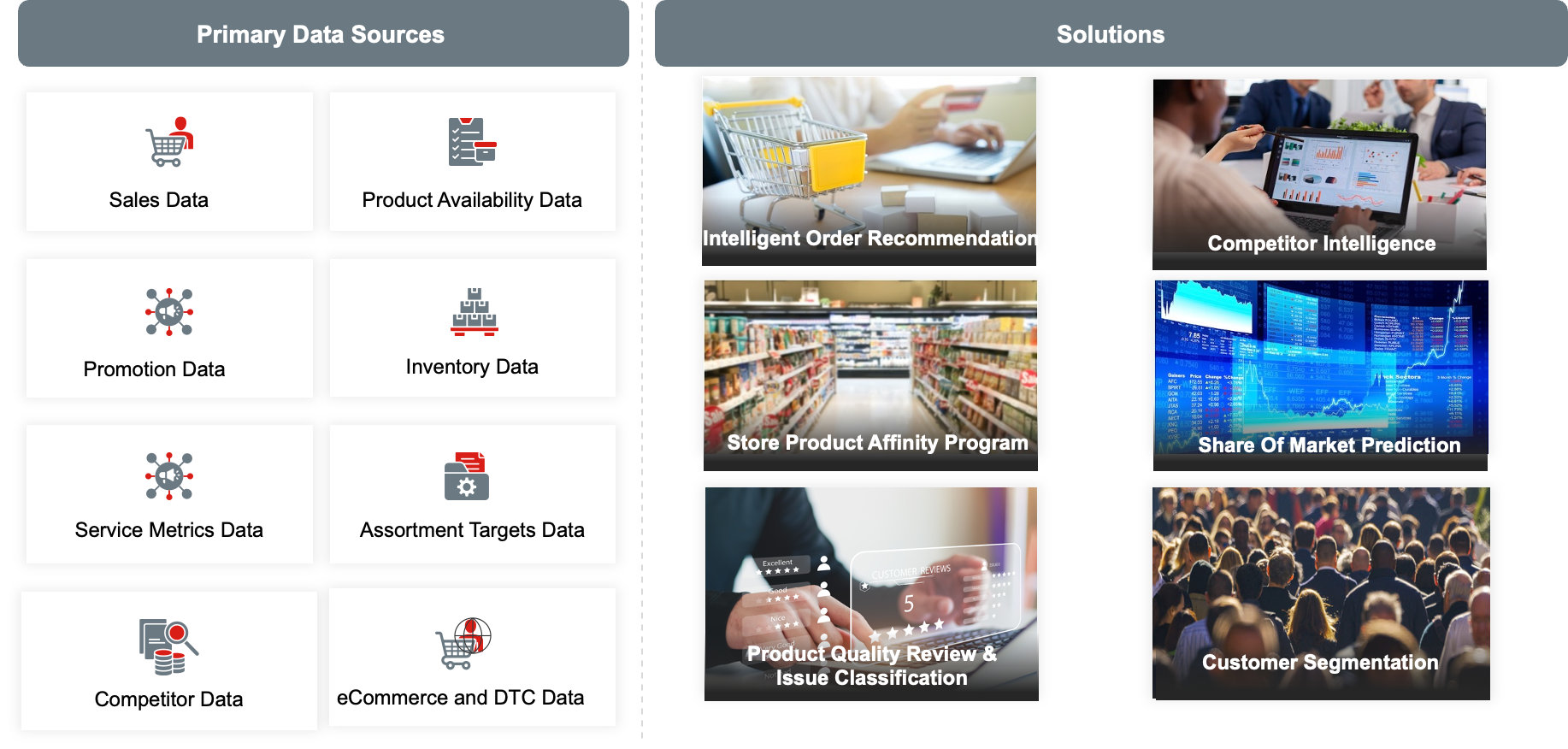 A large multinational beverage company was losing its share of market (SOM) in the snacks category in South America. We worked with the customer teams to identify drivers of this market share loss and build artificial intelligence (AI)–driven solutions. Some of the customer’s core challenges included: