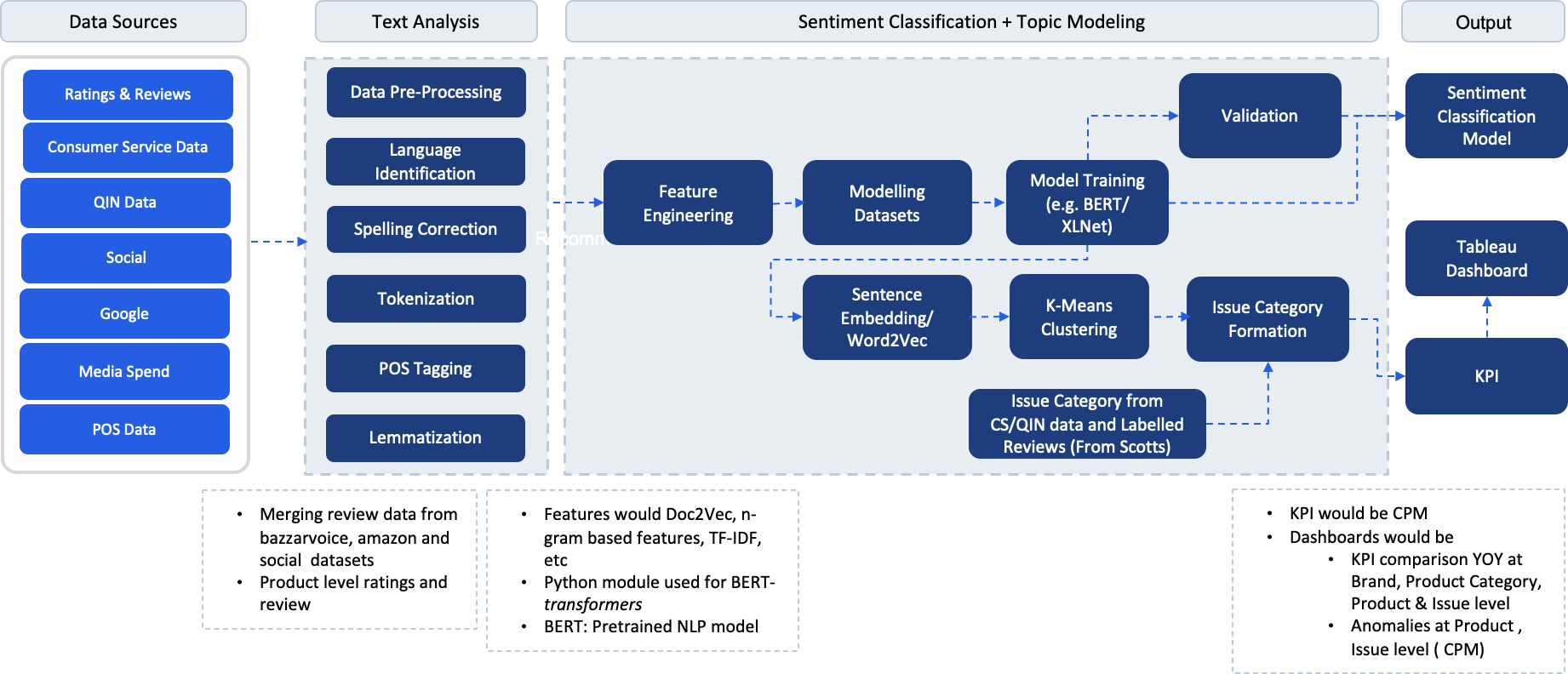 Sigmoid also implemented a solution to classify product quality reviews and identify product issues for this customer. By using Amazon Comprehend, which helps derive and understand valuable insights from text within documents, Sigmoid built a natural language processing-based system to analyze customer reviews and ratings on Amazon.com so that the customer can identify dissatisfied customers, provide a better customer experience, reduce churn, and boost product quality. This solution helped the customer to reduce complaints by 20 percent per million and increased its repeat sales by 8 percent in one quarter. Figure 5 shows the logical representation of the solution.