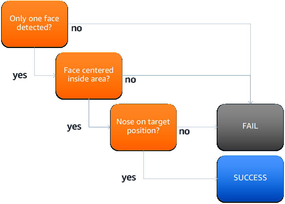 During the final verification, the challenge function invokes, for each frame image, the DetectFaces operation from Amazon Rekognition image. For each face detected, the operation returns the facial details. From all details captured from DetectFaces operation, we use the bounding box coordinates of the face, facial landmarks (nose coordinates), and pose (face rotation).