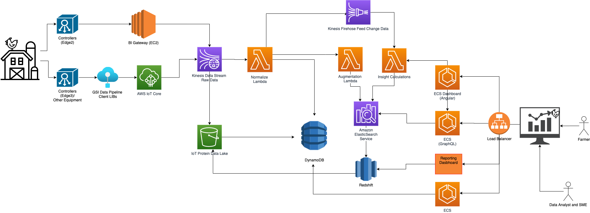- An ingestion system for processing the data, running models, and estimating target metrics. AGCO is building their Business Intelligence portal. It is run on Amazon Elastic Container Service (Amazon ECS), Amazon OpenSearch Service (successor to Amazon Elasticsearch Service), and code managed through the AWS CodePipeline. The system receives data from the farm-based controller gateway, decrypts and prepares the data for processing, and then transmits it to a raw Amazon Kinesis Data Stream. The Raw Kinesis Data Stream feeds into Amazon Simple Storage Service (Amazon S3) bucket and a Lambda function event where the data is validated and normalized. The normalized events have different downstream components including Kinesis Firehoses, an Augmentation AWS Lambda Function, and Amazon Simple Notification Service (Amazon SNS) topics to trigger AWS Lambda functions to calculate the animal feeds and water consumption. First, a Normalized Amazon Kinesis Data Firehose receives data messages and runs a Normalized Data Enrichment Lambda function to combine the Normalized Data with the farm and device data from the DynamoDB tables. Data is loaded into an Amazon ES database for the primary data visualization tool to access. The next downstream component of the Normalized Kinesis Data Stream is a Normalized Data Archive in Amazon S3 for potential R&D or BI teams to review. The final downstream component is a Downstream Kinesis Firehose that takes data from the Normalized Kinesis Data Stream to make data available for potential integration to other AGCO products the farmer uses. These three different components move data in a hyper-scalable and decoupled model.