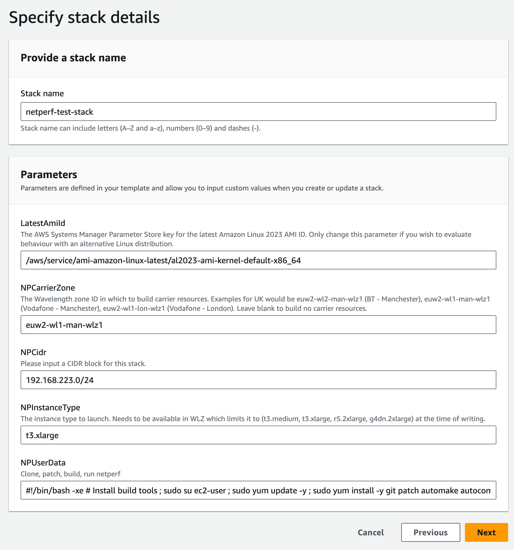 In order to build the infrastructure, you need an AWS account that is opted in to the Wavelength Zones you want to test, a process that is described here in the Wavelength documentation. You can download the AWS CloudFormation template from the aws-samples GitHub, here. You must launch the stack in the appropriate parent Region for the Wavelength Zones you want to test. You can find the full list of Wavelength Zone locations and their associated parent Regions here.