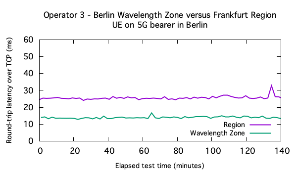 The Wavelength Zone in Berlin is over 400km from its parent Region of Frankfurt (eu-central-1), and so we expect to see a larger difference in latency in this case.
