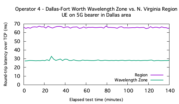There are several ways we can measure round-trip latency between two network devices, from an ICMP ping, to the use of benchmarking tools like iperf, netperf and others. In this case we are most interested in the difference between the latency from UE to the Region and the latency from UE to the Wavelength Zone. This means that the exact method is not all that important, because systematic biases due to the measurement technique should be removed when we subtract the two values. However, it is generally accepted that a user space-to-user space test using Transmission Control Protocol (TCP) is most representative of real-world application behavior, and so here we will use netperf’s TCP Request/Response (TCP_RR) test.