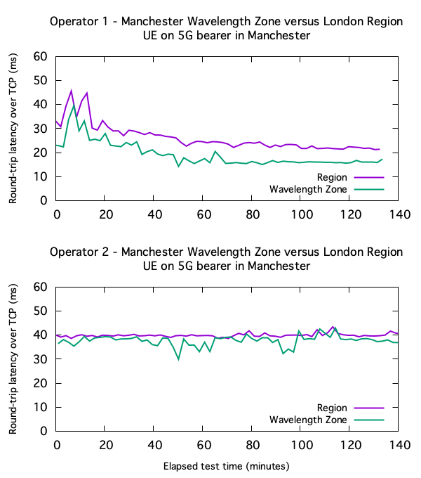 Manchester is around 250km from London as the crow flies, or an expected minimum of 2.5ms of round-trip latency purely due to signal propagation, using our rule of thumb. Therefore, for UEs physically located in or near Manchester, we would expect to be able to measure a meaningful difference in latency when we compare the nearby Wavelength Zones to the London Region.