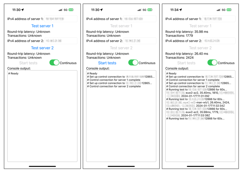Finally, we can run our tests by selecting Start tests. This runs a test for a duration of 60 seconds, first to server 1 and then to server 2. If the Continuous toggle is on when the test to server 2 is complete, then the cycle repeats. The output looks like figure 4(c).