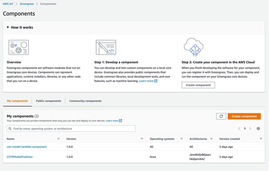 Both the inference function and the bridge are packaged into an AWS IoT Greengrass component, like the PINN model. Below, you will see the inference function and model components ready for deployment to an AWS IoT Greengrass device.