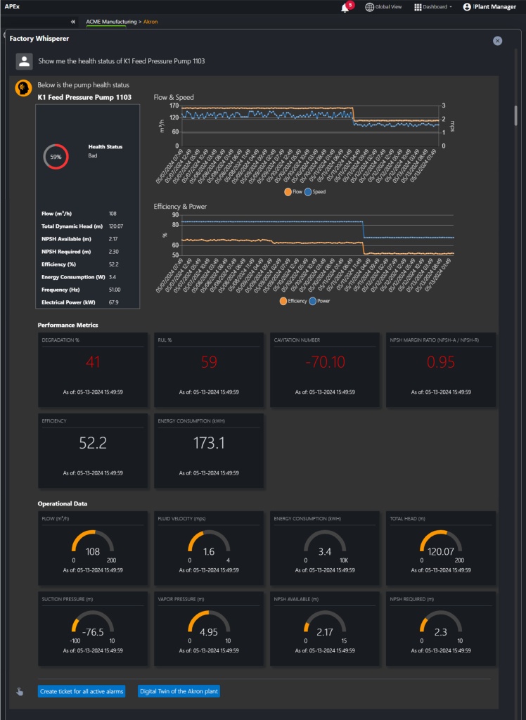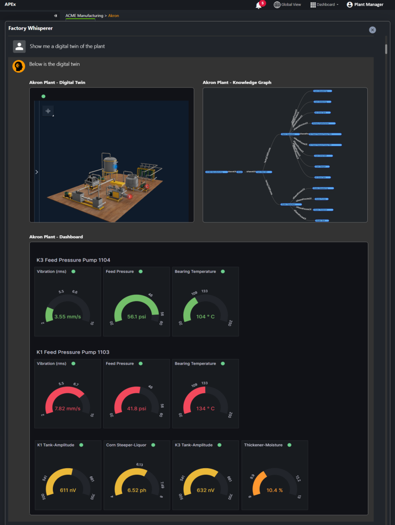 Figure 5: Factory Whisper chat bot within APEx solution shows the digital twin of the Akron plant along with critical machine metrics from pump assets from this plant.