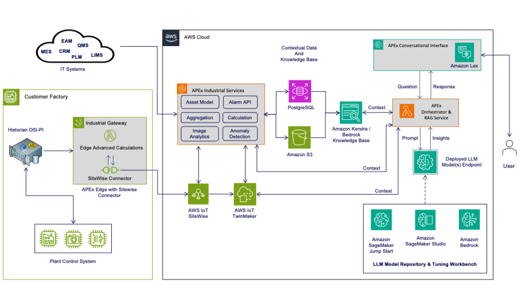 In this blog post, we expand on a prior blog post on Cognizant’s APEx solution and demonstrate how AWS IoT SiteWise, AWS IoT TwinMaker, and Amazon Bedrock are used to provide expert guidance to mitigate critical issues in the manufacturing plant. The solution parses operational data from the manufacturing environment, alarms, historical trends, troubleshooting results, workshop manuals, standard operating procedures (SOPs), and Piping & Instrumentation (P&ID) diagrams of a factory and associated assets. We will describe how customers use “Factory Whisperer”, Cognizant’s APEx generative AI assistant solution, to increase uptime, improve quality, and reduce operating costs for manufacturing organizations.