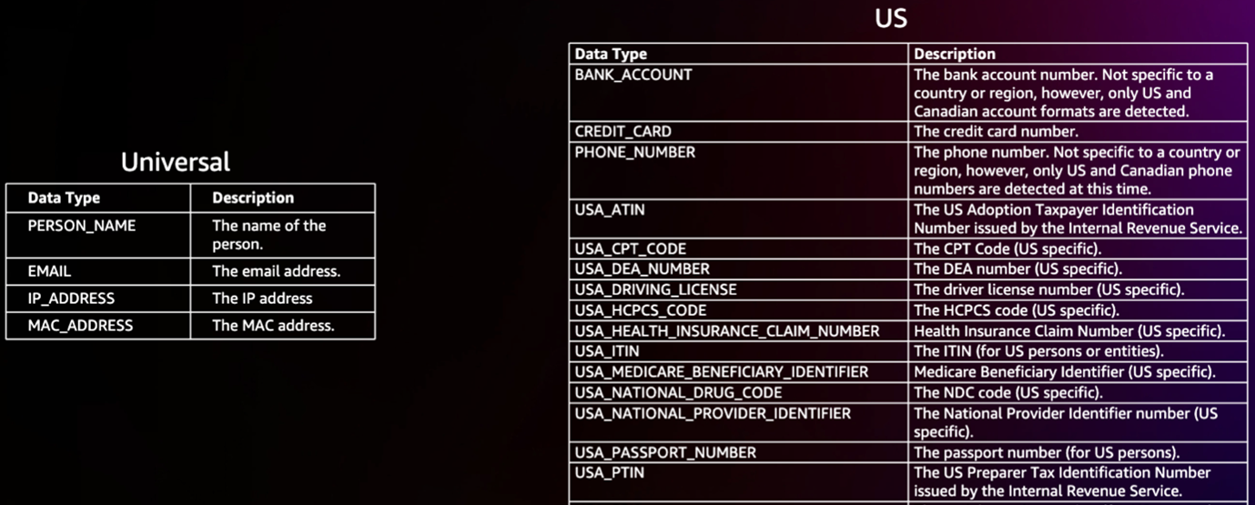AWS Glue Managed Sensitive Data Types examples (Universal and US-specific).