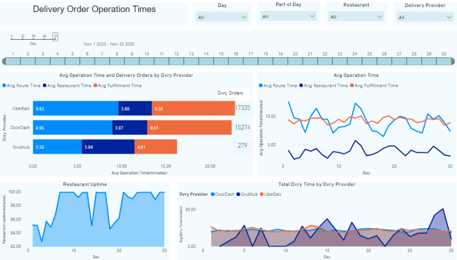 Let’s say a restaurant general manager wanted to evaluate the performance of its food delivery partners for all or some restaurant locations. In particular, the general manager desired to assess metrics such as:
