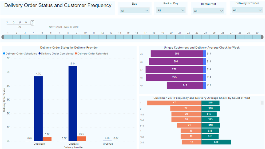 Summary of delivery order status by delivery partner (scheduled deliveries, completed deliveries, refunded deliveries) with customer analytics on visit frequency, average check size, and more.