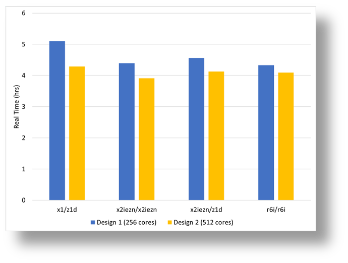 Customers can choose to run workloads in a heterogenous configuration with Amazon EC2 X2iezn as the primary node only or with Amazon EC2 X2iezn as the primary node and z1d as remote nodes to gain up to a 10% faster performance with more value compared to the all X2iezn configuration. With its high memory to core ratio, and large number of cores on a single instance, X2iezn was proven to be a good fit to meet Calibre nmDRC’s compute requirements.