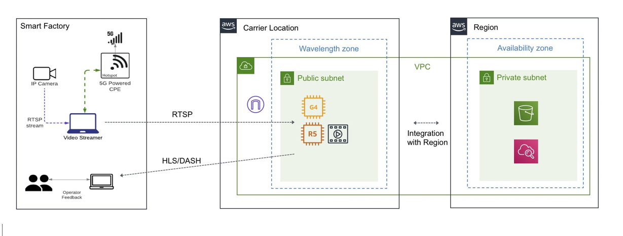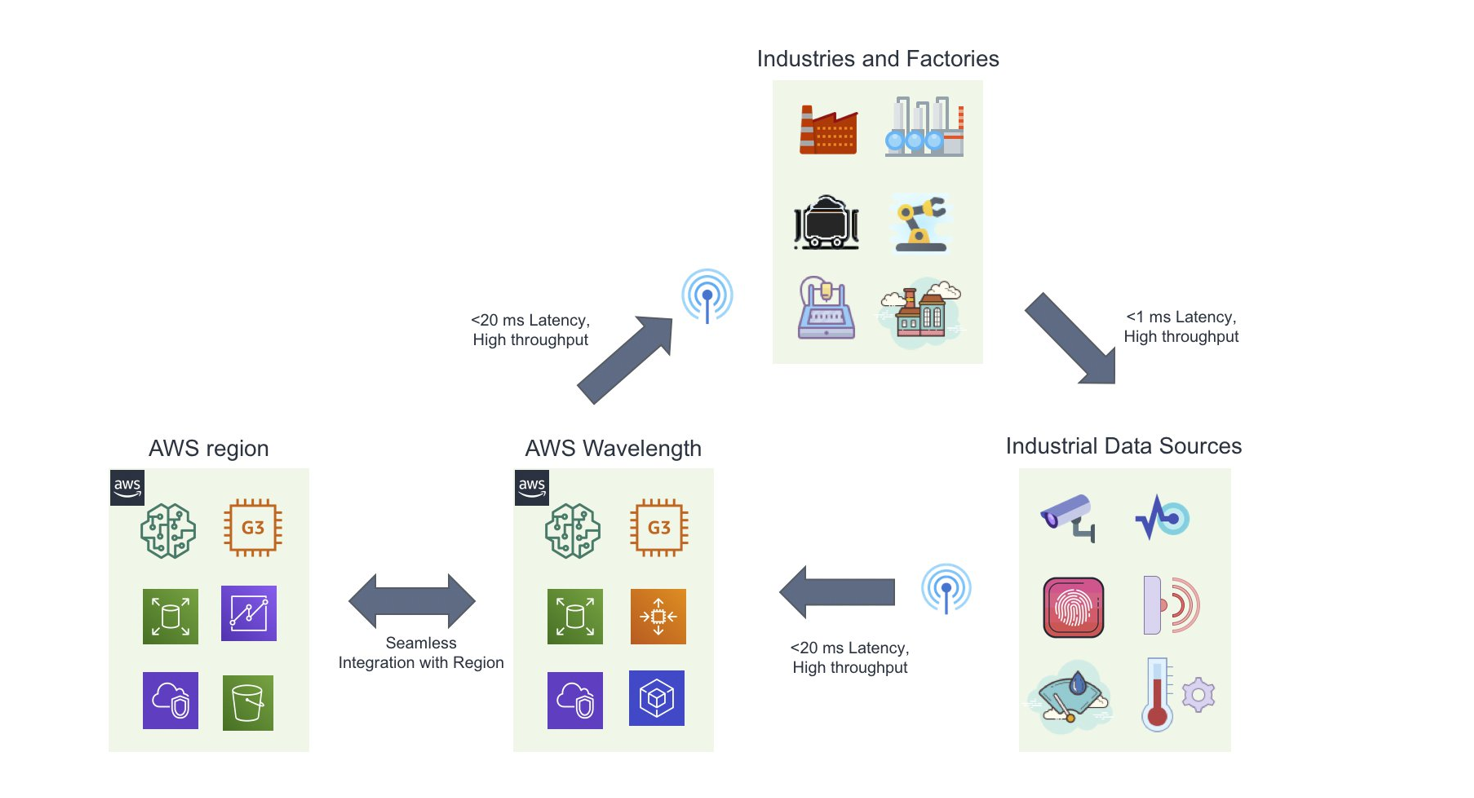 AWS Wavelength zones are AWS infrastructure deployments that embed AWS compute and storage services within the telecommunications providers’ data centers at the edge of the 5G networks. AWS Wavelength zones are also connected to a Region and provide seamless connectivity to access the breadth of AWS services in that Region. AWS Wavelength enables developers to build applications and deliver ultra-low latencies to any devices and end-users connected to the Mobile Carrier Service Provider network.. This enables smart factory applications that require ultra-low latencies including machine learning inference at the edge to run on AWS Wavelength.