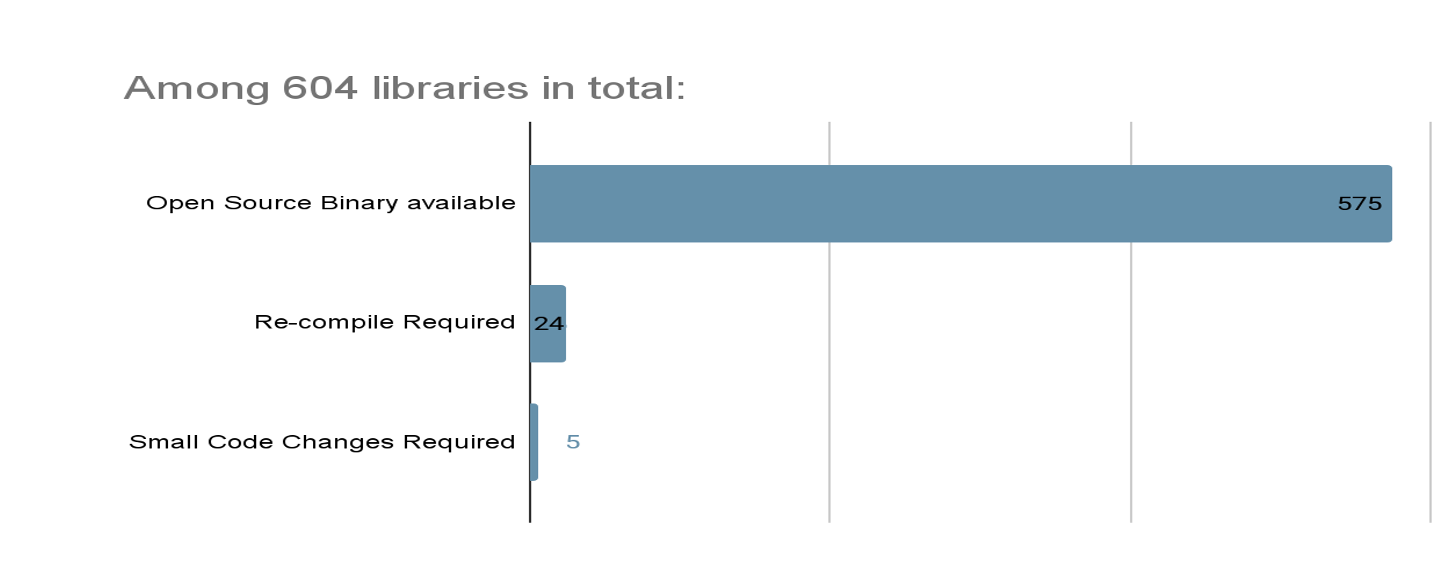 The effort was indeed smaller than expected, primarily because Tehama found out (discovered) that, among the 604 libraries on which they have dependencies, only 5 required code changes. These changes revolved around the build process (e.g., Makefiles, CFLAGS, etc.) for a few specialized media libraries that had not yet been ported to the arm64 architecture.