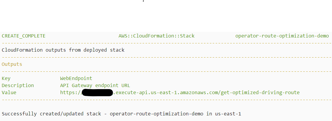 Load the AWS CloudFormation (an infrastructure-as-code provisioning tool) output WebEndpointin an internet browser to see an example of an optimized driving route recommendation.