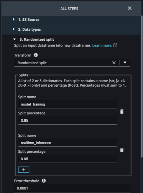 Import the new processed dataset into a SageMaker DataWrangler flow, using the approach outlined in the Prerequisites section. Then, create a randomized split using the built-in Split data transform.