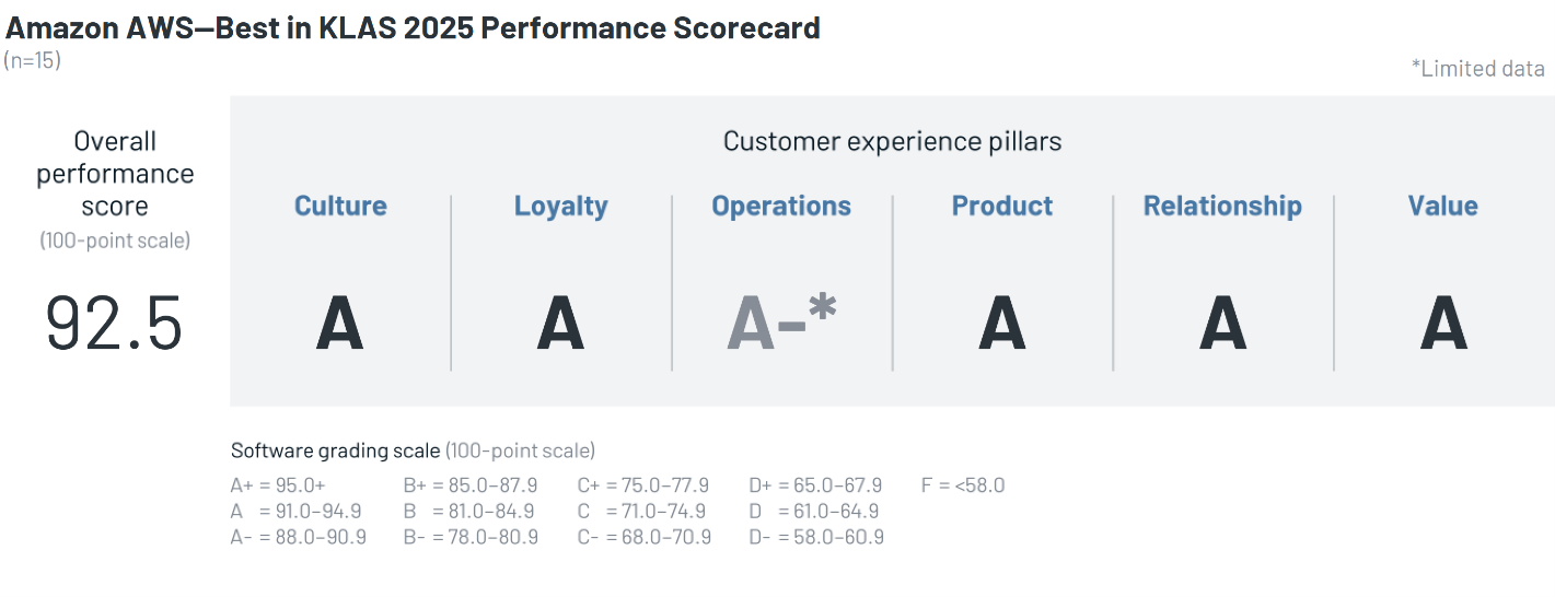 On February 5, 2025, KLAS Research awarded AWS Best in KLAS for Public Cloud. Best in KLAS is a designation given to healthcare technology and services companies that have been ranked highest by healthcare providers in the annual KLAS Research report. In 2025, KLAS introduced a brand-new category of Best in KLAS for Public Cloud. Based on ratings by healthcare providers, AWS is the top performer with a score of 92.5 in this inaugural category.