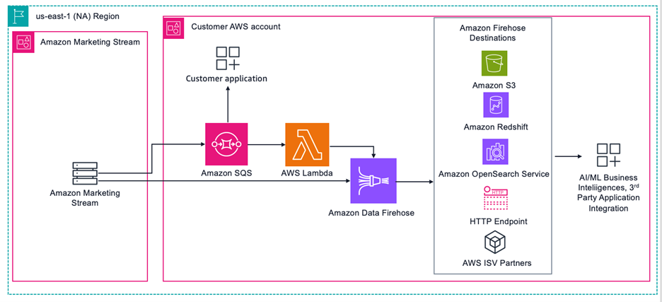 Amazon Data Firehose, a fully managed service for delivering real-time streaming data, is also a supported Amazon Marketing Stream destination. For use cases where data should be delivered to Amazon Simple Storage Service (Amazon S3), Firehose support streamlines architectures. Advertisers can have Firehose consume their Amazon Marketing Stream data and deliver directly to Amazon S3. No Amazon SQS queue or AWS Lambda functions are required with this approach.