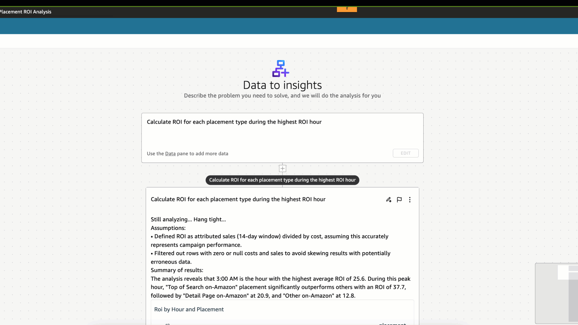 This animation in Figure 5 showcases how analysts and decision makers can use the QuickSight scenario feature. You can ask business-driven questions about ad placement return on investment (ROI) for a specific placement type and time frame. By asking a question, QuickSight autonomously retrieves the necessary data, performs calculations, and creates visuals to present the answer. This can greatly shorten time to insight for scenarios such as hourly ROI analysis, and conversion rates for every ad type and time of day.