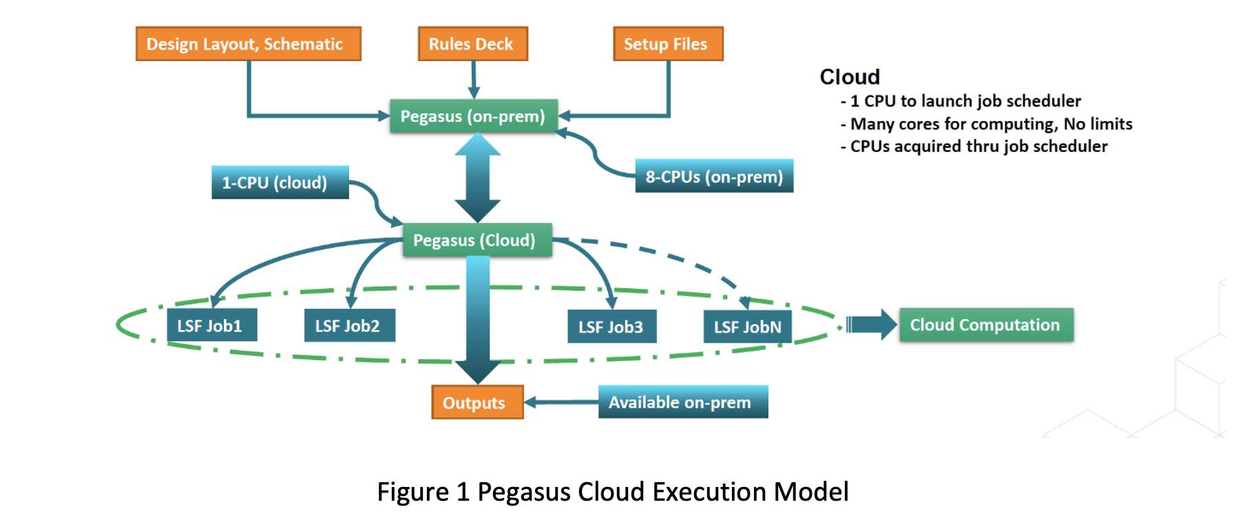 Testing of Pegasus performance on AWS was performed using Amazon EC2 X2iezn Instances. Cadence used an on-premises compute system with eight CPUs, which read in the design layout, schematic, and foundry decks. Using that data, the Pegasus system launched compute jobs on the cloud at the desired scale.